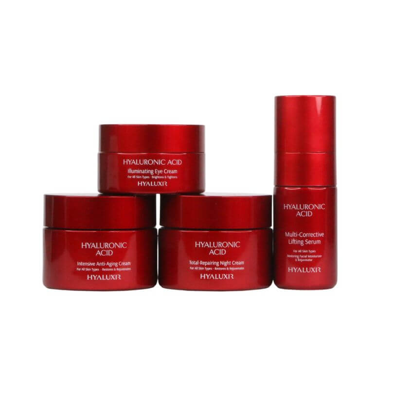 שגרת טיפוח מועשרת בחומצה היאלורונית המכילה 4 מוצרים – קרם יום אנטי אייג'ינג, קרם לילה, קרם עיניים וסרום של המותג Frulatte.